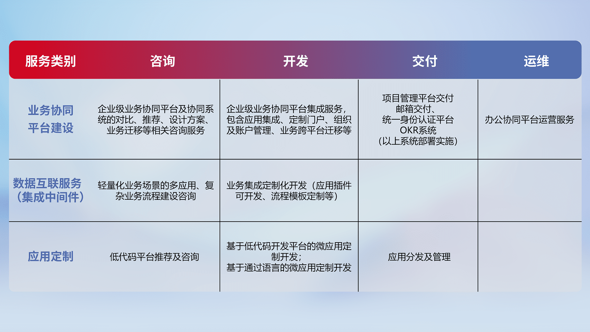 针对钉钉、、企微、、IDaas等平台级产品提供产品的规划、、、、方案、、、、交付、、定制化开发等服务,,,,实现如统一协同办公、、、、智能客户服务、、混合会议管理、、、智能数据查询、、等业务场景,,,,实现数字化转型。。